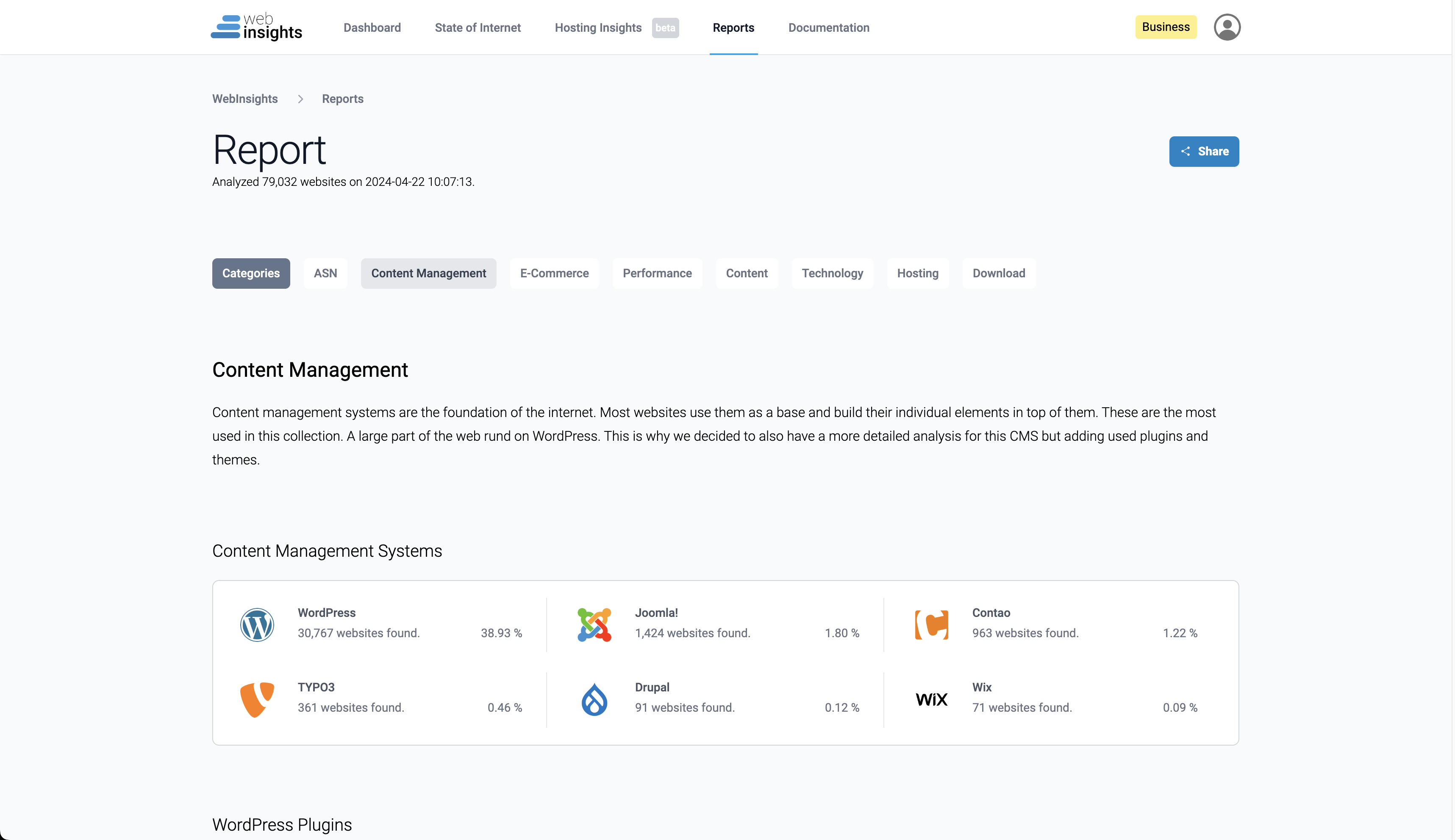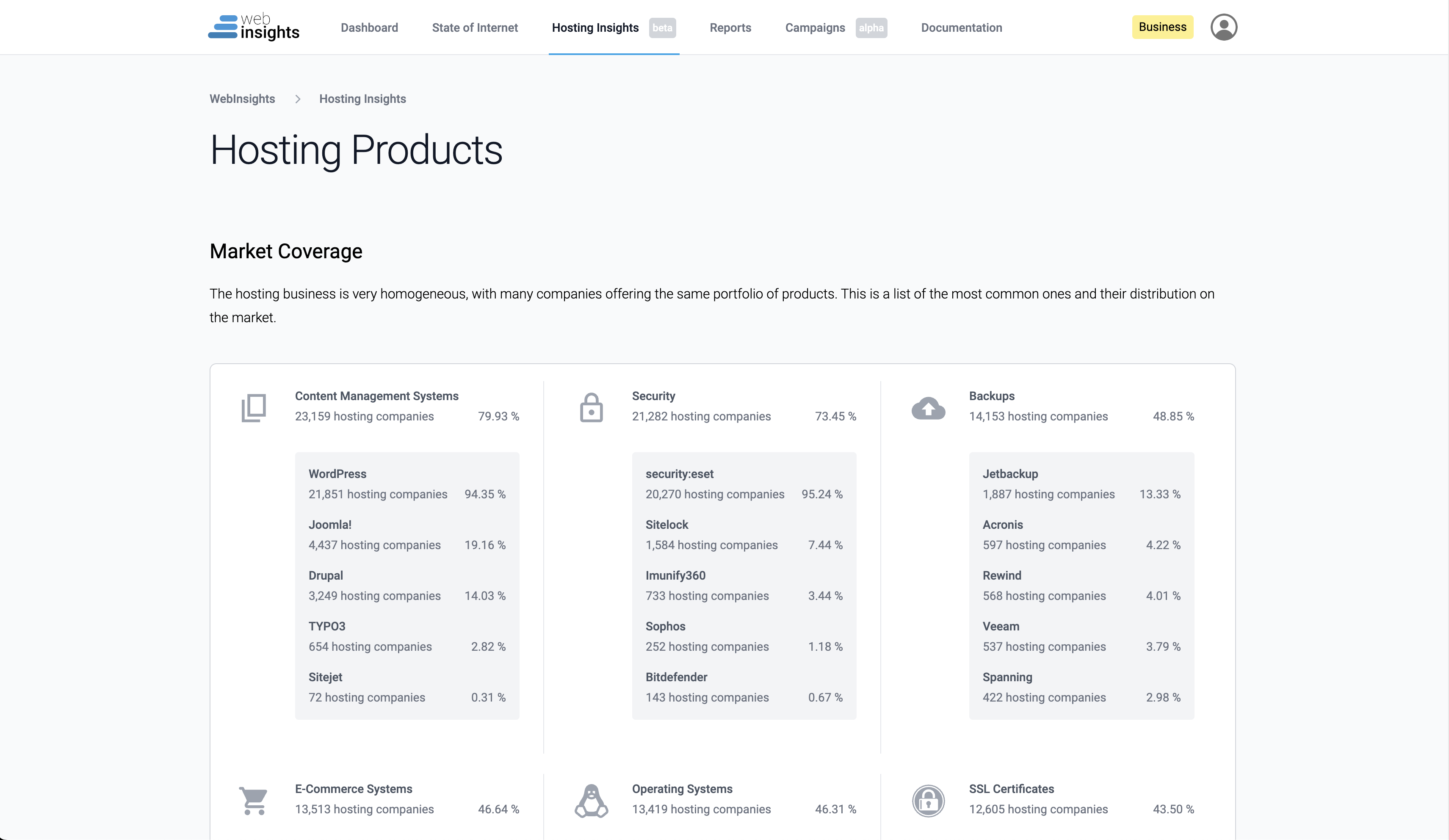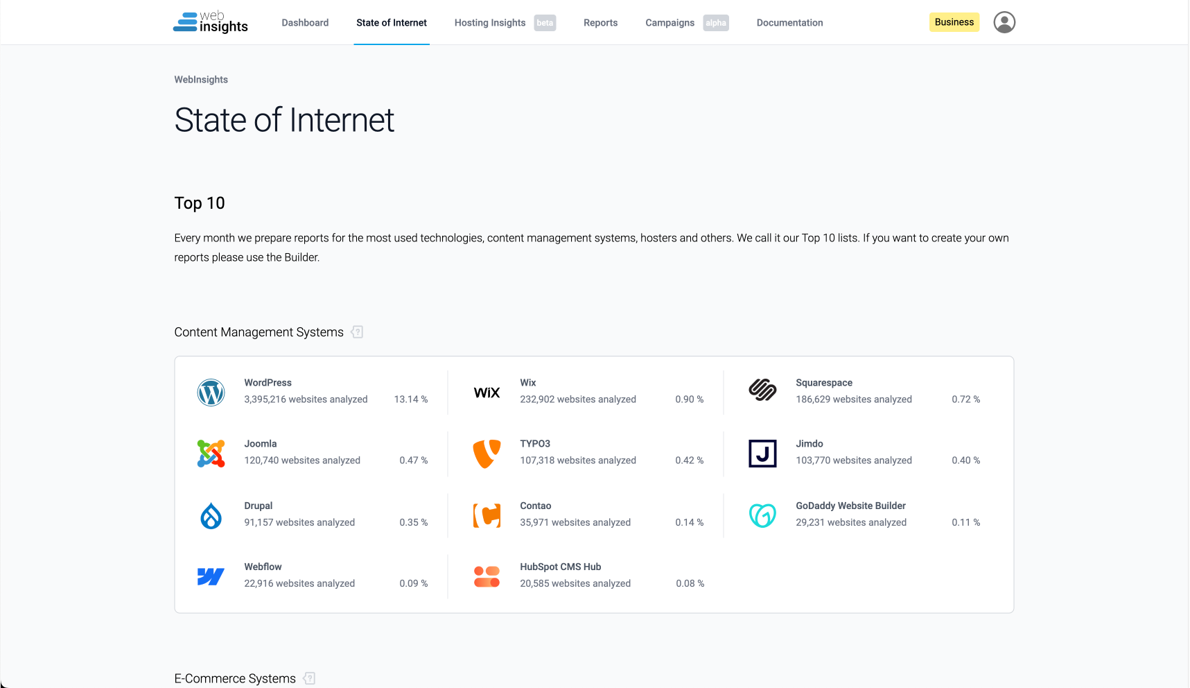 State of the Internet freeKnow the internet, its technologies, the industries. We visit more than 220.000.000 websites every quarter to collect our data.- Trends freeIs WordPress still the most important CMS? Do customers prefer the cloud? Where does the market move towards? We provide the tools to answer your questions.